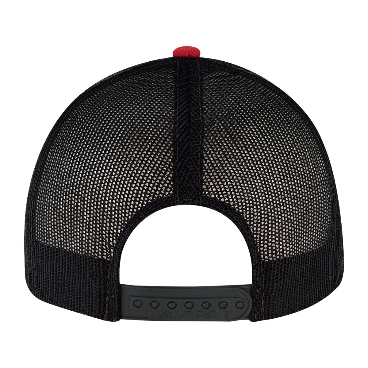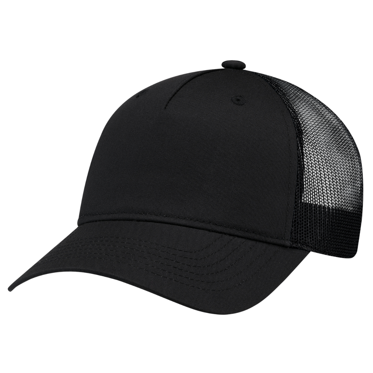 Casquette à 5 panneaux pleine forme avec dos en maille, avant renforcé en buckram avec surpiqûres Pro-Stitch. Visière pré-courbée à 6 rangées de piqûres et attache arrière ajustable en plastique.